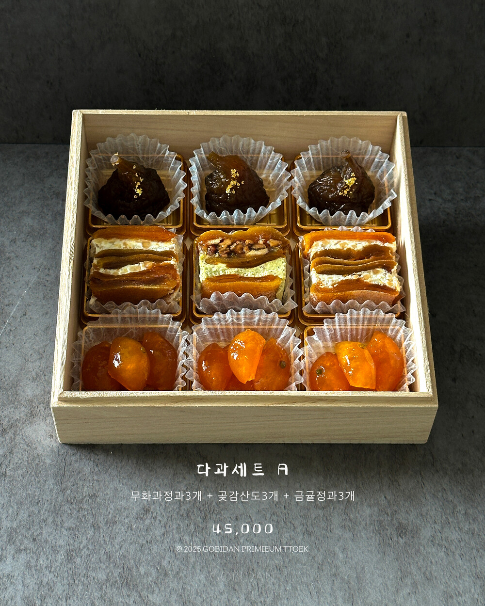 다과세트 A 구성은 무화과정과와 곶감산도, 금귤정과로 구성된 패키지입니다
