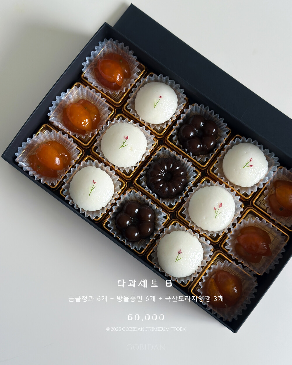 다과세트 B 구성은 방울증편과 국산도라지양갱, 금귤정과로 구성된 패키지입니다